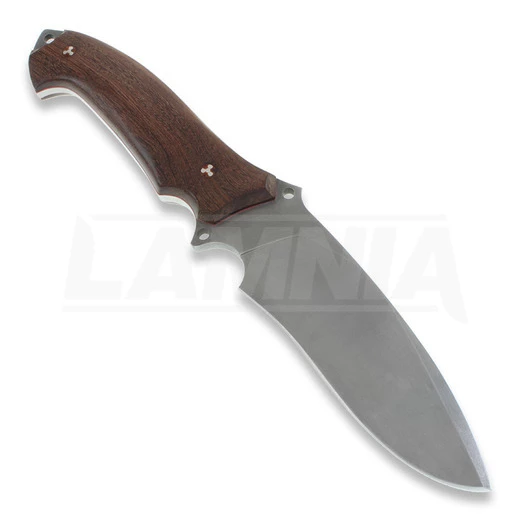 A real great companion for all outdoor activities. The impressive live weight is a good 405 g. The blade made of the best N695 by Böhler from Austria is designed in the full tang style and tapers towards the end of the handle to a thickness of 6.4 mm to 3.8 mm. The Buffalo Soul I is designed for rough, heavy use. Thanks to the polished edge and the second index finger mold, finer cutting tasks can also be performed with ease. The three bails allow the knife to be attached to the wrist or as a spear in combination with a stick. The protruding tang at the end of the handle can be used as a striking device. The solid and sturdy wooden handles made from Guyacan ebony harmonize beautifully with the durable Stonewash finish of the blade and are securely attached with decorative mosaic pins to the tang. Supplied with high quality brown leather sheath including push-button safety.