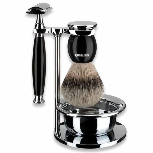 For generations, this classic shaving kit has been entirely made by hand. The traditional razor with exchangeable blade is said to be the first mechanical shaver. A marvel of precision and ergonomics that has been created for the ambitious user. The brush of pure badger hair and the shaver of black synthetic resin including chromed nickel-plated parts are both made by hand. Comes in an elaborately chromed metal box and metal stand.