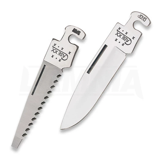 Closed: 5″; Blade: Stainless l Standard Edge; Other Info: Features stainless interchangeable clip, guthook, drop point and saw blades. Amber jigged bone handles with brass bolsters. Leather sheath features individual blade pockets.