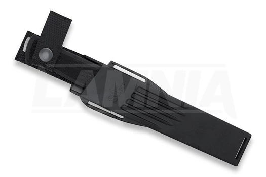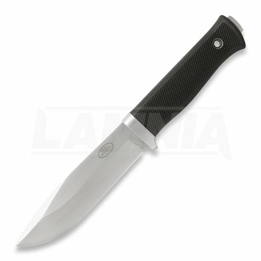 Satin finish laminated CoS steel modified clip point blade. Full tang. Black checkered Thermorun elastomer handle with lanyard hole. Black Zytel belt sheath. DC4 whetstone with leather pouch.