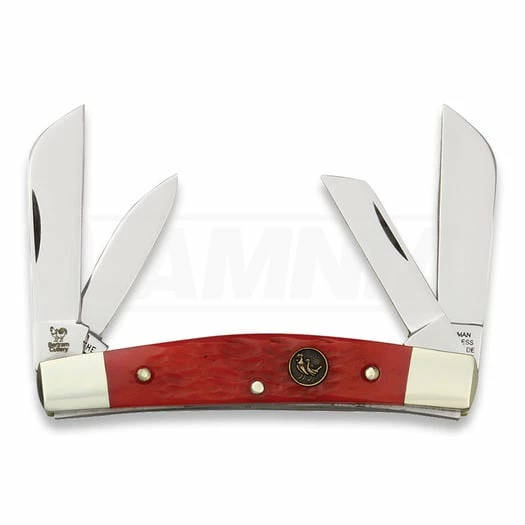 3.63″ closed. Mirror finish stainless dual sheepsfoot, coping, and pen blades. Red pick bone handle. Nickel silver bolster(s). Inlay shield.