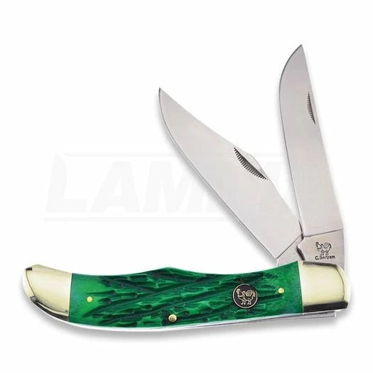 5.25″ (13.34cm) closed. Satin finish stainless clip and skinner blades. Antique green jigged bone handle. Nickel silver bolster(s). Inlay shield. Black nylon belt sheath.