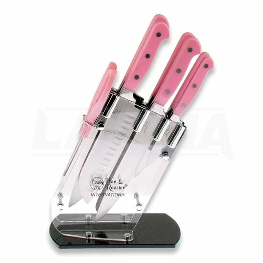 Knives feature stainless blades with pink ABS handles. Full tang. Includes one of each: 13 1/4″ overall kitchen knife with 8″ blade, 13 1/4″ overall slicing knife with 8″ blade, 13″ overall bread knife with 8″ serrated blade, 12 3/4″ overall Santoku with 7″ blade, 9 3/4″ overall utility knife with 5″ blade, 8 1/4″ overall paring knife with 3 1/2″ blade, and kitchen shears. Comes with seven-slot plexiglass storage block.