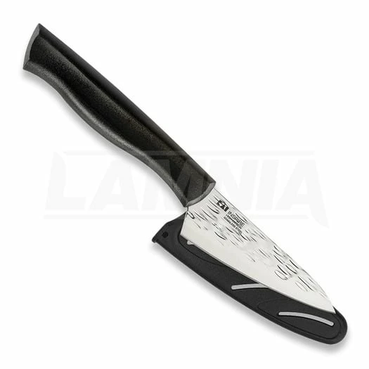 Inspire Series. 8.5″ overall. 3.5″ hammered finish 4116 stainless blade. Black synthetic handle. Hand washing and drying recommended. Do not use scouring pads, steel, or gritty cleansers. Black molded plastic sheath.