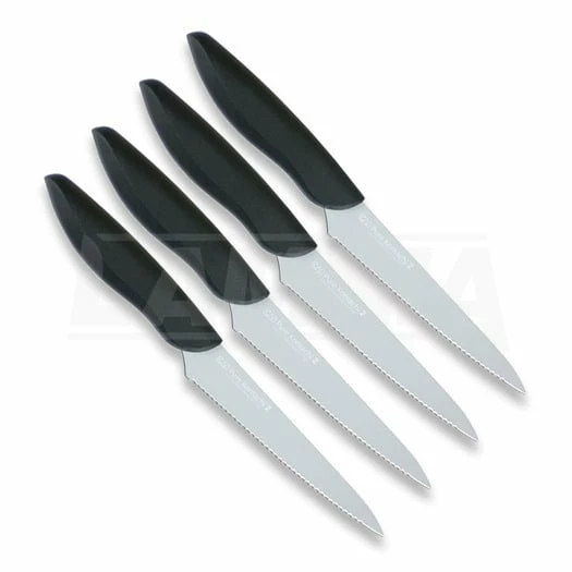 5″ matte finish serrated high carbon stainless blade. Black synthetic handle. Set of four.