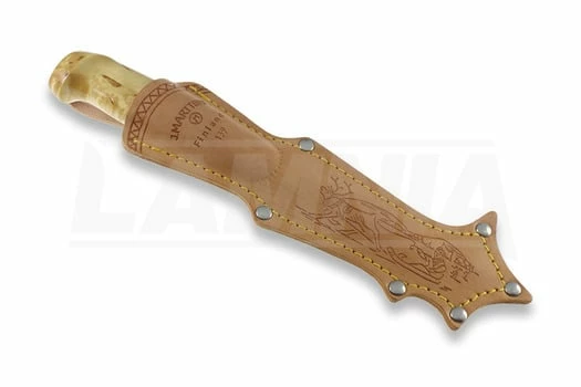 This knife has a 13 cm long blade of stainless chrome steel featuring the traditional upturned point. The handle is of curly birch, and the leather sheath features traditional Lappish scenes.