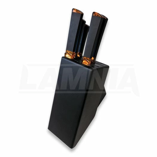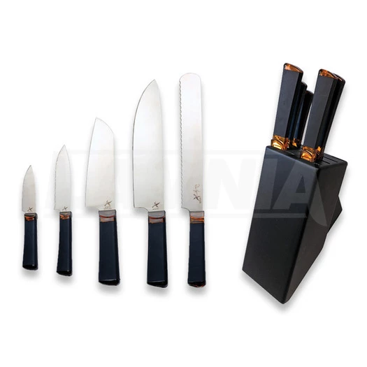 Satin finish stainless blade. Storage block. Includes: 15.3″ overall bread with serrated blade; 15″ overall Chef’s; 12.3″ overall Santoku; 7.6″ overall paring; 9.6″ overall utility. Amber and black agilite handle.