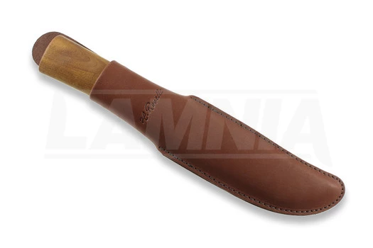 Roselli’s first knife model, Hunting knife, with a durable Roselli Wootz, UHC-blade. Ultra High Carbon=UHC is manufactured by Roselli and it maintains sharp longer than ordinary carbon steel. That means that it is not necessary to sharp so often and with UHC is much easier to work. Hunters have noticed this. It is possible to skin even two moose without sharpening. A hunting knife is a popular choice among hunters and campers and it can be used for whittling, cutting or handling fish or game. The heat-treated birch handle with a linseed oil coating ensures a firm grip, even when wet. Hunting knife comes with a handcrafted sheath made from tanned leather.