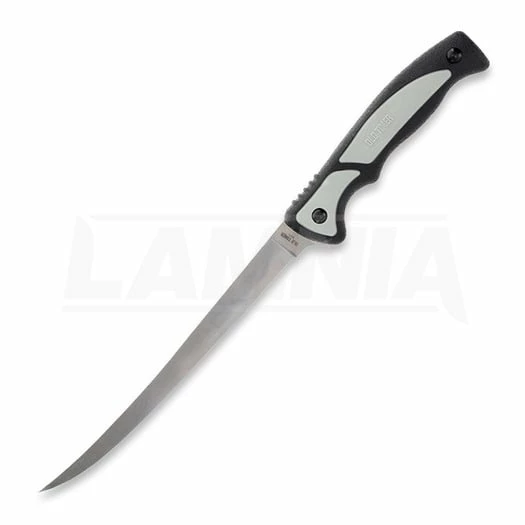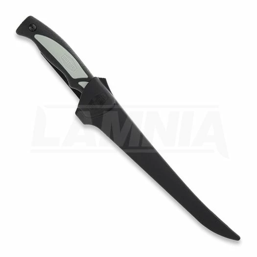 12.75″ (32.39cm) overall. 7.5″ (19.05cm) satin finish stainless fillet blade. Black and gray TPE handle. Black synthetic belt sheath. Boxed with hanging tab.