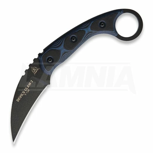 7.38″ overall. 3.13″ black traction coated 1095HC steel hawkbill blade. Black and blue G10 handle. Full, extended tang. Finger ring. Black Kydex belt sheath.