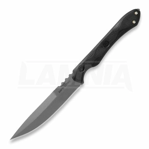 Rapid Strike. 8.5″ overall. 4″ tumbled finish 154CM stainless blade. Black G10 handle. Lanyard hole. Glass breaker. Full tang. Single edge blade. Black Kydex belt sheath. Designed by Leo Espinoza.