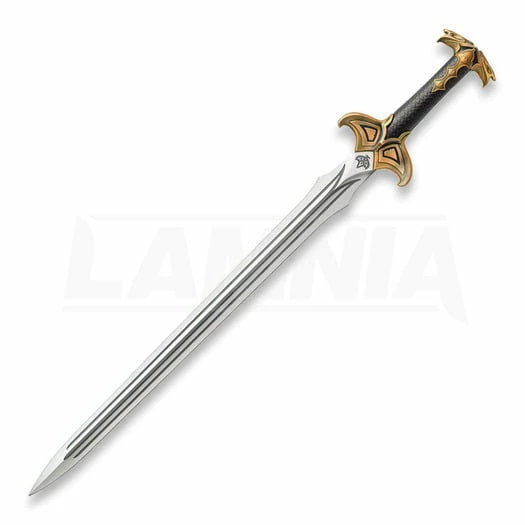 Features a hilt bearing design motifs of ancient Dale, with a pommel in the shape of twin bird heads and a leather wrapped grip embossed with an overlapping scaled feather pattern. The blade is adorned with engraved grooves and a rune etching. Reproduction of the prop used in the filming of: The Hobbit: Battle of the Five Armies.