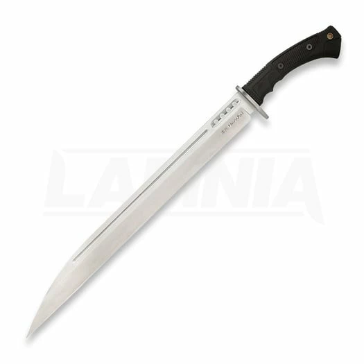 25.75″ (65.41cm) overall. 19.38″ (49.23cm) satin finish 7Cr17MoV stainless blade. Black contoured TPR handle. Steel guard. Full tang. Lanyard hole. Weight reducing thru-holes. Black leather belt sheath.